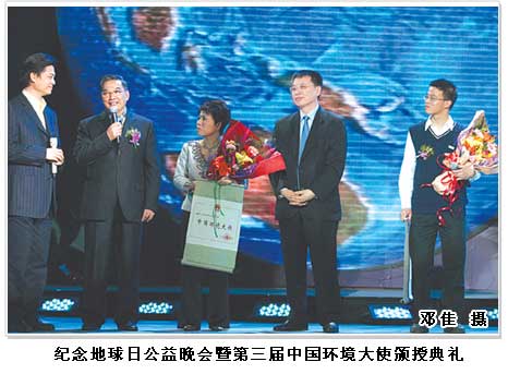 本報4月22日訊 “紀念地球日公益晚會暨第三屆中國環境大使頒授典禮”今日在京舉行。宋祖英等10人被環境保護部聘為新一屆“中國環境大使”。全國政協副主席李金華、國家發改委副主任解振華、環境保護部副部長潘岳等出席頒授典禮。