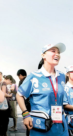 昨天,歌手譚晶來到鳥巢旁的志愿者服務(wù)站,履行她作為奧運志愿者的義務(wù)。