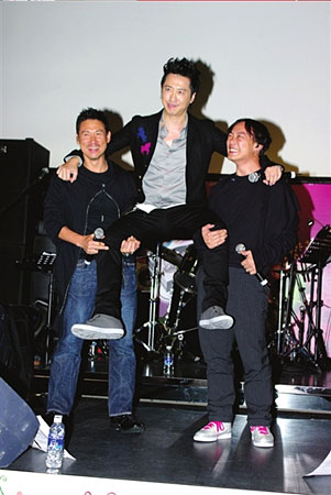 發布會現場,心情不錯的庾澄慶經常大笑得前仰后合,張學友和陳奕迅更是讓他興奮不已。兩位好哥們兒送上大包的零食,祝福庾澄慶在香港更加“吃得開”。在哥兒仨開唱之前,張學友特別提醒眾人:“請大家注意歌詞。”庾澄慶哭笑不得地唱起了《愛你的只有一個我》,張學友和陳奕迅一邊和聲一邊搞笑地伴舞。拍合影的時候,張學友和陳奕迅合力把站在中間的庾澄慶扛上肩膀,張學友還不忘問道:“這下心情好很多了吧?”再三被追問如何對待妻子伊能靜的“外遇”,庾澄慶說:“處理完之后會告訴大家的。”至于是否擔心這個時候推出新碟會被質疑借機炒作,庾澄慶表示:“我不會拿家里的事情做新聞點,更何況這件事情很重要。如果我不工作把自己關在家里,就是很好的解決方式嗎?不是。” 記者 朱雅清