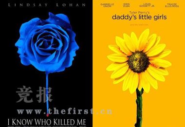 簡單的畫面,開得正旺的鮮花上若隱若現著一張臉,干凈利落。不過不要以為換了顏色,我們就看不出了。當然,黑底藍花渲染了《我知道誰殺了我》的恐怖氣氛,向日葵讓《爸爸的女兒》溫暖的主題更深入人心。