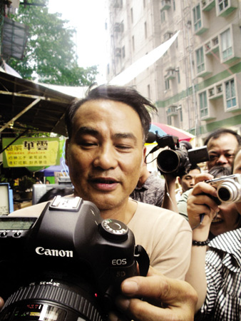 昨天的拍攝地點(diǎn)叫永利街。那是很窄的一條街道,其中一邊已經(jīng)改造成了高樓,另一邊則保留了一些舊樓。劇組在舊樓這邊搭了些鐵架和舊式廣告招牌,營(yíng)造上世紀(jì)60年代的氣氛。導(dǎo)演羅啟銳介紹:“這條街是香港最后一條60年代老街了,本來(lái)已經(jīng)要拆掉,但是政府為了關(guān)照我們,特意推遲到我們拍完再拆。我們用這條街來(lái)重現(xiàn)當(dāng)年的深水埗!备邩谴髲B的存在有時(shí)挺影響拍攝,“經(jīng)常穿幫,要靠后期特效來(lái)消除”。據(jù)說(shuō),導(dǎo)演小時(shí)候就住在這里。