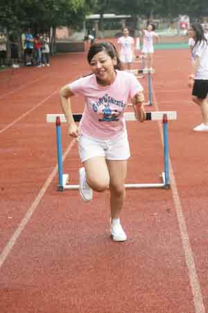 而接下來的跨欄更是讓人笑彎了腰,除了大牙和小蠻這兩個身高腿長的美眉能一跨而過,其他人都是慢吞吞地“走欄”——一腳跨過去,站定后另一腳才跨,特別是MeiMei,跑步的笨拙姿勢讓大家大笑不已。而到跳高時,鬼鬼幾乎是連攀帶爬,姿勢十分狼狽,難得她躍過后還露出自信的微笑。而筱婕、小蠻和Apple都是雙手攤平,企圖正面跳過去,可是每次都落得個肚子壓住橫竿的結局,被黑人揶揄為“狗爬式。”