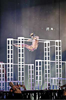 郭富城穿著由張叔平設計的新裝火紅閃閃“愛的戰衣”大唱情歌,更祝愿觀眾鴻運當頭。郭富城自彈自唱環節雖彈錯了數個音,但也應觀眾要求再彈奏鋼琴,郭富城唱至《狂野之城》一曲還大秀好身材,演唱會上還有郭富城好友的兒子沖破保安防線,上臺獻花給他,至于架上體操歌舞環節更因絆腳險跌,郭富城即用力支撐身體繼續演出。