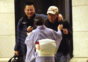 近日,記者遇到了姜文一家三口外出吃飯的溫馨場面。凌晨2點左右,姜文被攙扶著走出酒館。一同走出的還有周杰及一位友人。一行人已走出很遠,突然,從店內追出一位女服務員。原來醉酒的姜文離開時忘了穿鞋,服務員親自幫姜文把鞋穿上,豪爽的姜文送上一個熊抱。