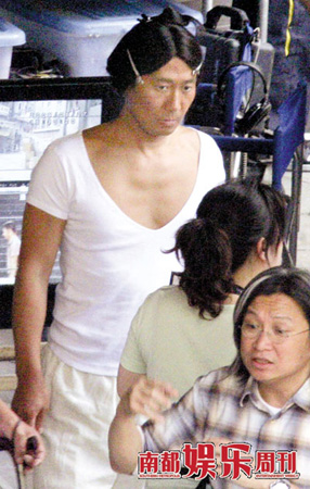 在《十月圍城》中,黎明放下天王巨星的架子,扮演一名乞丐,也是“六義士”之一。乞丐已經是一個夠倒霉的角色了,沒想到片場休息,黎明把假發一梳弄,竟成了驚世駭俗的天王級“如花”,不過據說扮丑很容易拿影帝,黎明顯然是下定決心不怕犧牲了,剛剛出演過梅蘭芳的粉面就直接被化妝師糟蹋成黑臉,還特別給這位沒錢理發的乞丐先生留了一頭換七八糟的長發。長發未免有點熱,黎天王倒也挺能應付,脫了戲服穿件“老頭衫”,還用兩個發卡把頭發梳弄上去,有利散熱。攝影師的長鏡頭在片場找了很久,才終于在導演棚里找到了“黎如花”。