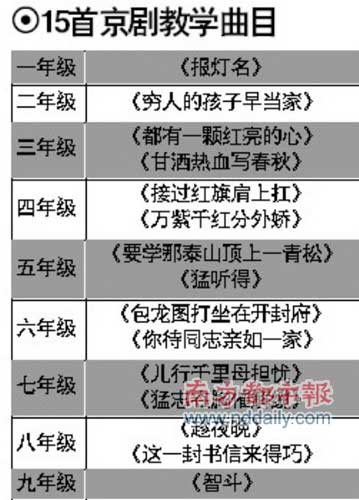 昨日廣東省教育廳體育衛(wèi)生與藝術(shù)教育處副處長何志強(qiáng)告訴記者,他剛剛看到了教育部的文件。要求是每省選擇一個(gè)重點(diǎn)市開展試點(diǎn),每省選20所學(xué)校,分別是10所小學(xué)和10所初中,在音樂課程中增加京劇曲目教學(xué)。教育部要求從2008年3月到2009年7月在北京、天津、黑龍江、上海、江蘇、浙江、江西、湖北、廣東、甘肅等10省市開展試點(diǎn)工作,并在試點(diǎn)的基礎(chǔ)上逐步在全國推開。