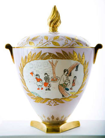 李亞鵬在2009年度嫣然天使基金慈善晚宴新聞發(fā)布會(huì)上表示,晚宴現(xiàn)場(chǎng)拍賣所需的藝術(shù)品已基本到位。其中,最吸引眼球的拍品無(wú)疑就是由兩位“潛力藝術(shù)家”竇靖童、李嫣聯(lián)手設(shè)計(jì)的Wedgwood-Trophy Vase(瑋致活—?jiǎng)倮?精致骨瓷。據(jù)悉,Wedgwood是英國(guó)傳統(tǒng)陶器品牌,竇靖童、李嫣為T(mén)rophy Vase所創(chuàng)作的這一設(shè)計(jì),取材于一家人融洽相處的畫(huà)面,表現(xiàn)出小孩眼中的溫馨家庭氛圍和每個(gè)人都渴望得到的關(guān)愛(ài)。