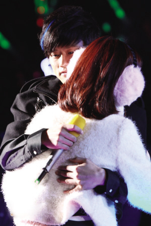 張杰與謝娜的戀情從2007年延續至去年,其間話題始終不斷,就在兩個月前,兩個人還傳出了分手的消息,但到了跨年演唱會當晚,人們看到的依然是一如既往的甜蜜畫面:在演唱會的舞臺上,張杰深情地看著謝娜,還沒開始唱歌,謝娜的眼淚就已流了下來,接下來,張杰更現場改掉了《何必在一起》的歌詞,兩個人一起唱出了“我們要在一起”,當張杰擁抱住已經哭成淚人的謝娜時,場面被渲染得如偶像劇一般浪漫感人,粉絲更是尖叫連連。