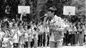 羽泉赴災區捐水捐書 現場發錢捐助20名貧困生(圖)
