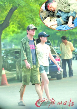 為了不讓外人認出,潘粵明與董潔都將帽檐壓得很低,兩人十分悠閑地邊走邊聊。從行走狀態上看,潘粵明已能行走自如,只是步履比較緩慢,董潔顯得比較緊張,還不時看看潘粵明臉上是否有不適的感覺。當天董潔的左手中握著一卷褐色的物品,很像是醫用繃帶之類的東西,看樣子是為潘粵明準備的。