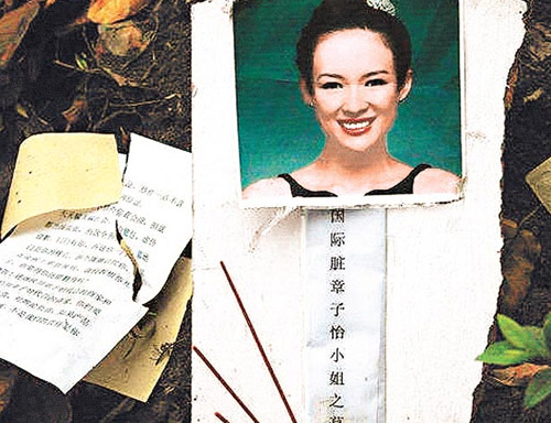中新網6月6日電 據香港媒體報道稱,內地一網站張貼了一張章子怡被人惡搞的相片,圖片顯示在成都一個公園的垃圾桶旁有一個貼上章子怡相片的“墓碑”,相片下寫了“國際臟章子怡小姐之墓”,墳前亦有燒完的香燭以及悼辭,但悼辭全是辱罵章子怡的字句。