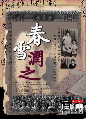 中新網廣州9月25日電 (記者 索有為) 毛澤東,驕陽的寵兒,孤獨的父親。由廣州話劇藝術中心出品的“建國大戲”——《春雪潤之》將于今日晚在廣州十三號劇院面向公眾上演,用全新視角探尋偉人毛澤東的人父情懷、講述毛澤東的舐犢之情。
