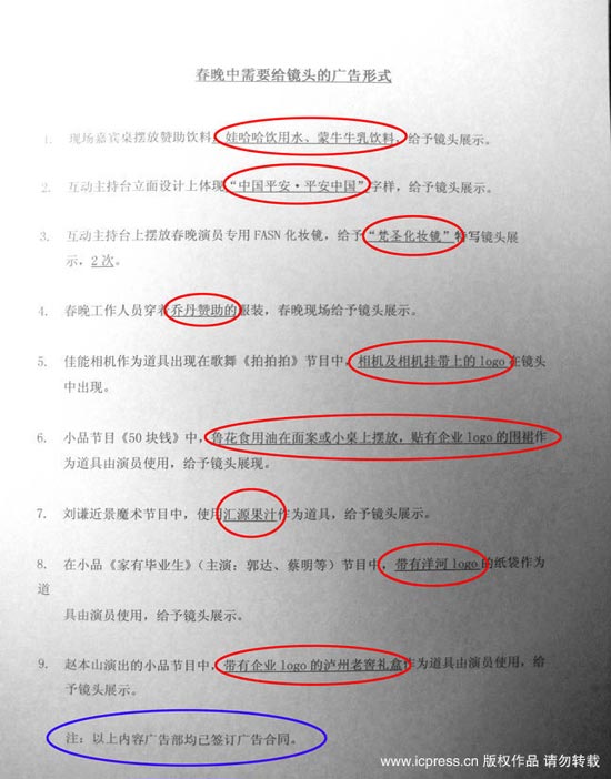 近日網(wǎng)絡(luò)上曝光的一張題為“春晚中需要給鏡頭的廣告形式”清單上共列出九條廣告植入條目,包括飲用水、化妝鏡、服飾、相機、酒等,外界十分關(guān)注的劉謙魔術(shù)、趙本山小品《捐助》、郭達(dá)蔡明的小品都有涉及。