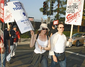 中新網11月7日電 美國編劇協會發動大罷工,好萊塢影視圈都受沖擊,電視尤其災情慘重,包括“迷失”、“反恐24小時”等,新一季拍攝進度整個被打亂,劉玉玲新戲“Cashmere Mafia”更從原定本月底在美首播,變得上檔遙遙無期。而“犯罪現場調查”女主角馬格·海根伯格與艾美獎影后、《俏媽新上路》主演茱莉亞·劉易斯·德瑞菲斯,現身聲援編劇,跟著他們高舉抗議牌。