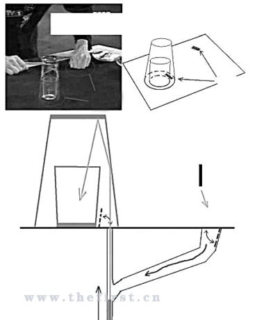 網友分析:在這個魔術中,我們可以注意到,大杯與小杯中間仍有縫隙,大杯是倒著放的,小杯則是正立著套在大杯里的。黑色的桌布主要是為了掩飾從桌下彈射硬幣的出口。在表演時,劉謙攥著硬幣的手曾一直放在桌子的左下角,其實那里正是硬幣進入的地方。經過桌下的機關,硬幣順勢滑到杯子下方。觀眾們看到的是硬幣從小杯子與大杯子間的桌面射進大杯然后被大杯壁和大杯底2次反彈后落入小杯中的。經推斷,劉謙應該還在桌子某個位置布置了一個彈射硬幣的機關,從而讓硬幣從桌布下面射出來。