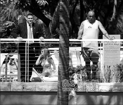 5月3日,女星珍妮弗·安妮斯頓在游泳池旁曬陽光浴。身穿布料極少的性感比基尼的安妮斯頓目前正在邁阿密拍攝自己的新片,酒店還特別派了兩名壯碩的保鏢守衛安妮斯頓的安全,并防止fans們上來索要簽名及拍照,給了安妮斯頓很好的寧靜時光狂煲電話粥。