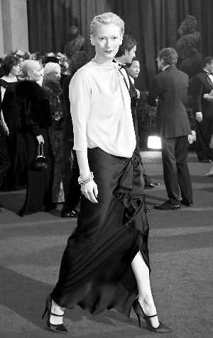 蒂爾達在奧斯卡一向喜歡以特立獨行的雷人裝扮出現,這次同樣沒讓人失望。暗淡的淺金色加黑裙搭配很怪異,像去趕一場普通會議,艷麗的紅唇又好像彰現奢華,總之過于隨便。