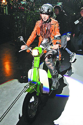中新網1月12日電 創(chuàng)作歌手陳綺貞前晚在臺北小巨蛋的首場演唱會吸引1萬名粉絲,昨晚第2場依舊座無虛席,她一共換穿5套衣服,除了報童裝、軍裝,還以安全帽、皮衣打扮,騎上價值40萬元(新臺幣,下同)的復古機車,演唱新歌《魚》時又換上有閃閃鱗片的洋裝,化身美人魚。