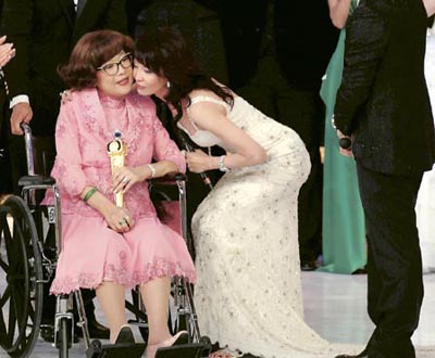 中新網11月19日電 香港無線2007“萬千星輝頒獎禮”前晚(17日,下同)舉行,現場整晚的高潮是肥姐親自接受“萬千光輝演藝大獎”。當肥姐坐著輪椅出現時,大會司儀鄭裕玲(嘟嘟)在另一邊已激動得掩臉流淚。肥姐以堅毅的語氣說出不會放棄喜歡的電視事業,那一刻,背后站著向她致敬的演員們不少已哭成淚人。