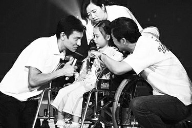 影視明星張國立講述的是《任思雨的故事》。北川有個叫任思雨的6歲女孩,她的雙腿被卡在廢墟中,當救援隊員趕來時,她咬緊牙關說:“叔叔,我不怕,你們不用擔心!”在救援過程中,這位受傷女孩忍著疼痛,輕輕地唱起了兒歌《兩只老虎》……歌壇“天王”劉德華上臺后,跪在這位坐在輪椅上的女孩前,對她說:“你是我們的驕傲!你讓我們感到敬佩!”接著,他率領眾多港臺明星唱起了歌曲《承諾》。