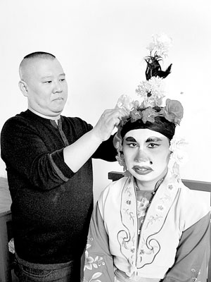 日前,德云社相聲劇《唐伯虎點秋香》在大興的一個影棚內(nèi)拍完定裝照。幾乎所有演員的化裝都是郭德綱親自上手。