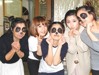 Ella(中)拉著媽媽(左一)和二姊(右)扮成貓熊,把Hebe(左二)和Selina笑翻了。