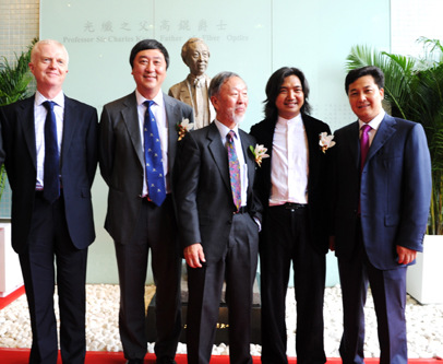 中新網9月29日電 據寧夏僑聯消息,9月27日,香港中文大學舉行了高錕雕像揭幕典禮,由諾貝爾物理學獎高錕伉儷、校長沈祖堯教授及著名雕塑家吳為山教授主禮,中國僑聯副主席朱奕龍應邀參加揭幕儀式,與中大校領導、教授以及人文學者等師生代表近百余人共襄盛舉。