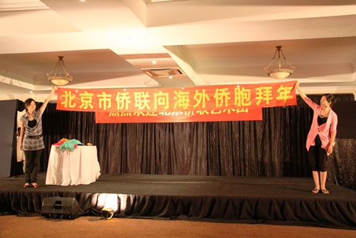 16日晚,北京市僑聯(lián)藝術(shù)團(tuán)的藝術(shù)家們?cè)缭缇瓦M(jìn)入演出現(xiàn)場(chǎng),進(jìn)行演出前的準(zhǔn)備工作,晚7點(diǎn)鐘,演出正式開(kāi)始。在2個(gè)小時(shí)的演出中,藝術(shù)家們?yōu)楫?dāng)?shù)?00多名僑胞奉獻(xiàn)了一場(chǎng)精彩紛呈的視覺(jué)盛宴,獨(dú)唱、舞蹈、相聲、變臉、魔術(shù)等豐富多彩的藝術(shù)形式讓在場(chǎng)的觀眾大飽眼福,掌聲連連。