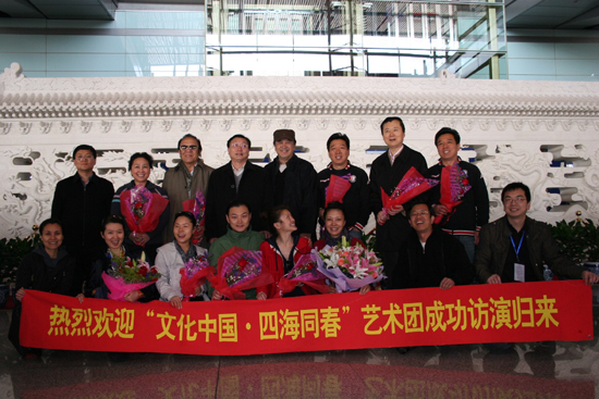 中新社北京3月9日電 (南若然)結束在南美四國23天的慰僑巡演之后,9日下午,“文化中國·四海同春”赴南美洲藝術團載譽返回北京。該團團長、國務院僑辦副主任馬儒沛在首都機場接受中新社記者采訪時表示,赴南美巡演“鵬程數萬里,廣交四方友,笑迎八面風,演繹中華情”,并創造了四個之最。