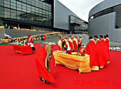 澳門文化中心揭幕典禮上正在舉行宗教祈福儀式。該文化中心座落在澳門新口岸填海區海邊,其建筑造型設計新縪,將成為澳門城市的一個標志。
